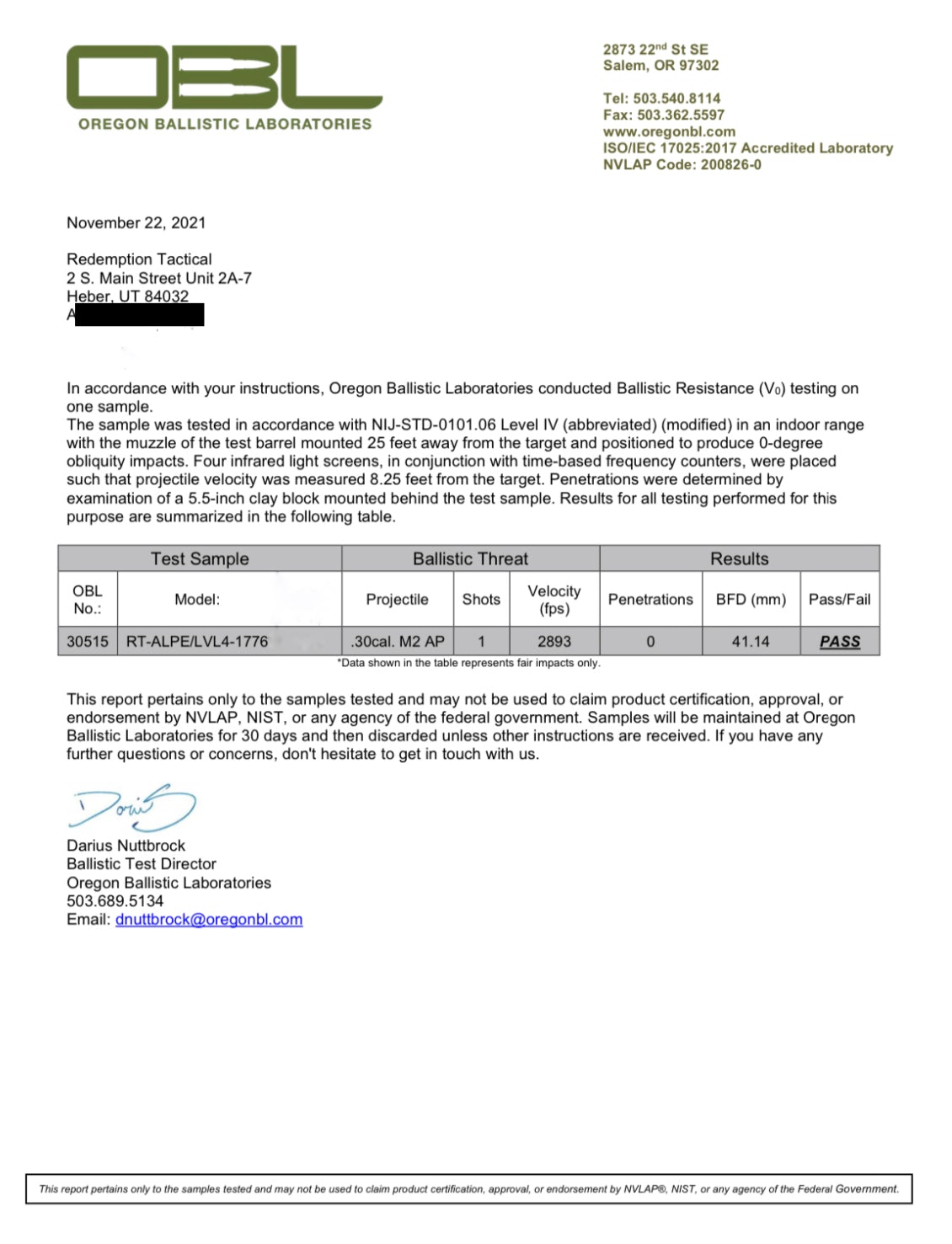 Our armor is independently tested and certified to NIJ 0101.06 standards by Oregion Ballistics Lab, which is an NIJ-approved testing facility accredited by NVLAP and A2LA to ISO 17025.