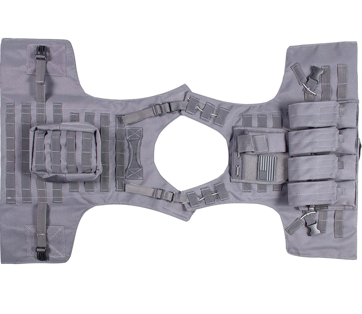 All pouches are attached to the PALS Molle and can be reconfigured to different locations on the vest. SIZE AND FIT It is adjustable for universal fit up to US Mens size XXL (18"x45" so up to 45" waist).