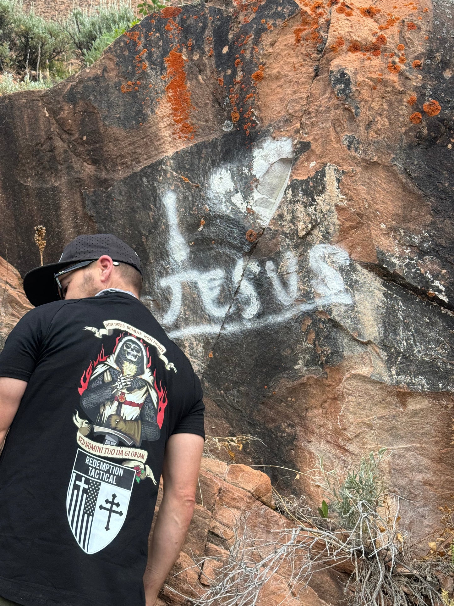Has our Crusader Glory to God graphic on the back, and the Redemption Tactical logo on the front with our crusader Christian flag on the left sleeve.